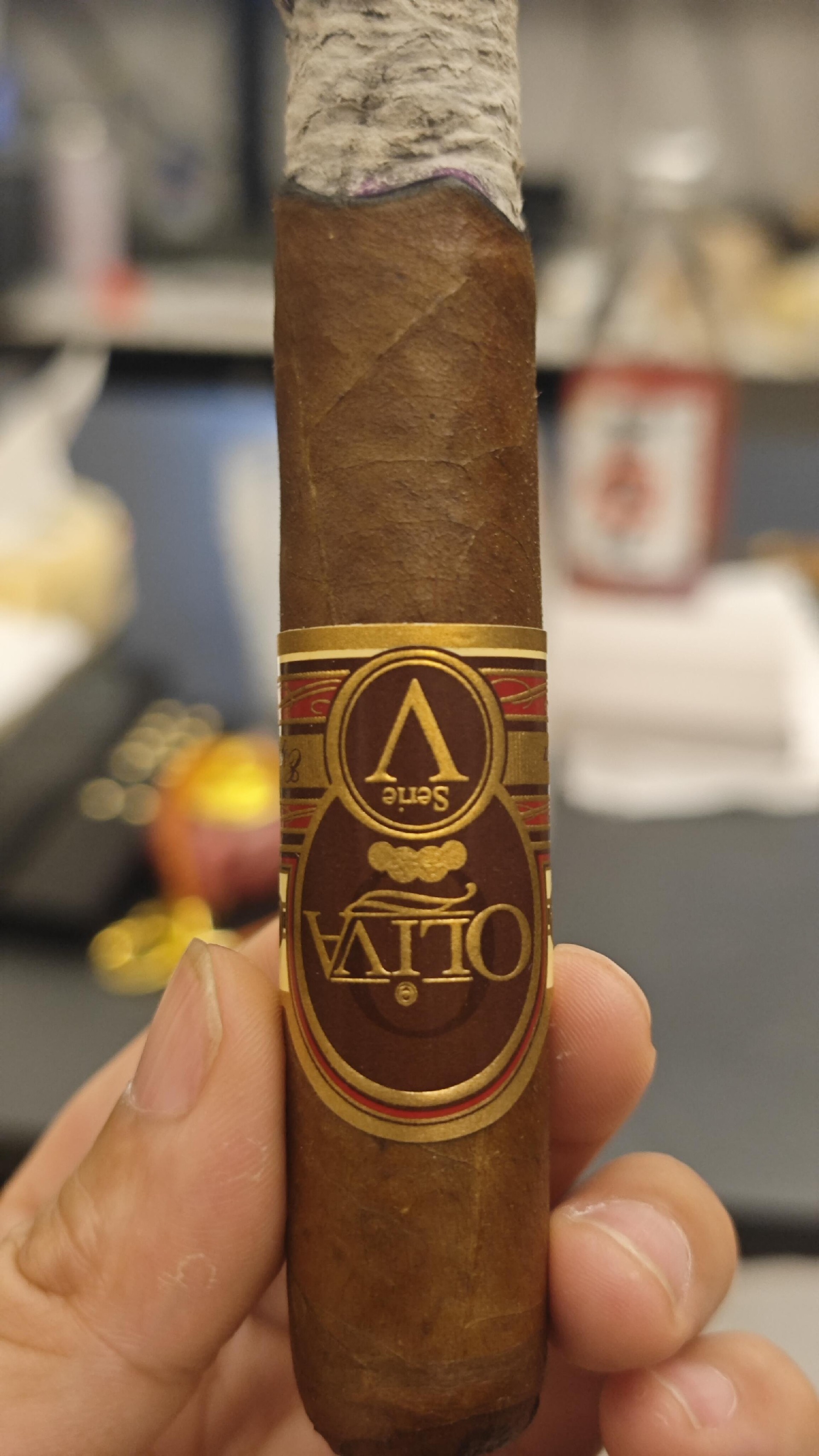 今晚一起玩奥利瓦V系列特级罗布图,红盒铝管包装很有质感,拆开就能闻到淡淡的巧克力香。点燃后第一口——黑巧+烤坚果的组合,烟气饱满但很顺滑,不会呛喉。中段咖啡和皮革味慢慢透出来。
