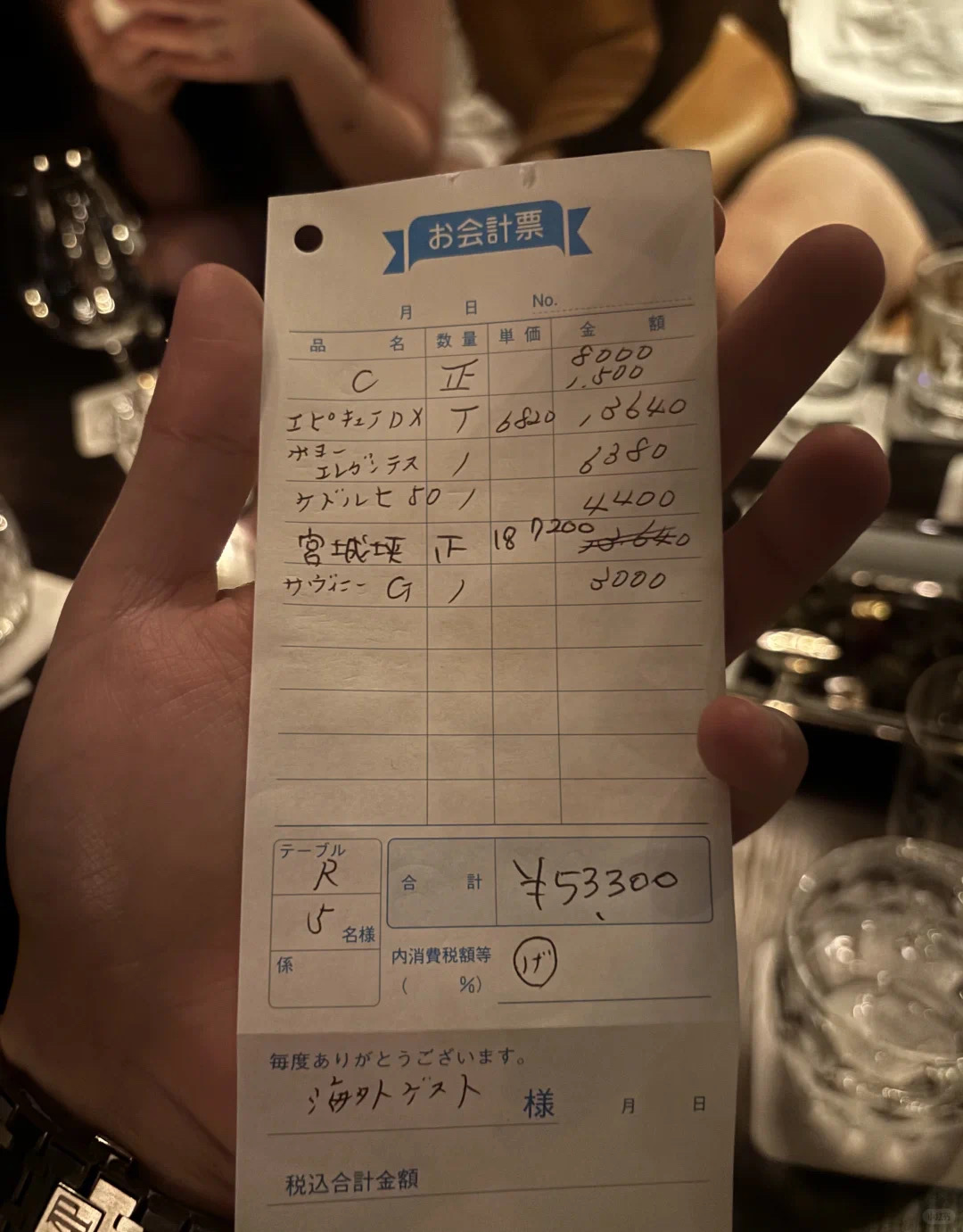 就这样一个来小时 已经快结束了门外熙熙攘攘上来一群人有说有笑的进了包间 声音很大也很杂乱 我们随行的翻译 他告诉我们外面的女孩子应该都是陪老板来二场的花魁 说到这大家懂得都懂 我们也准备Happy ending打道回府 结果服务员递来账单我一看 我有点蒙圈了 大概跟大家解释一下:座位费2000日元一个人 不点饮品要收1500日元 服务费要10%税费要10%